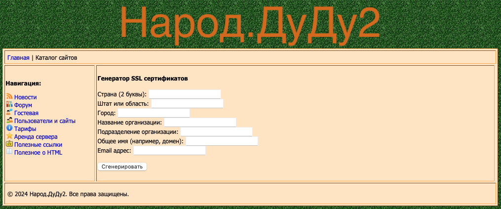 На нашем сайте вы можете создать бесплатный самоподписаный SSL сертификат, для этого передите на Народ.ДуДу2 Если не работает, есть другая ссылка [http://hosting.dudu2.ru/ssl.php]