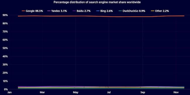 «Яндекс» стал вторым самым популярным поисковиком на ЗемлеДата: 13 декабря 2024